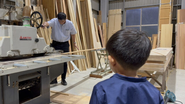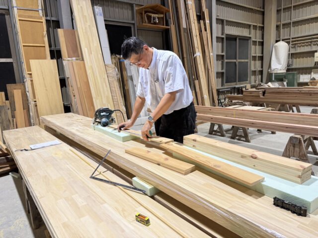 かわいい孫のために何かを制作しているじいじ