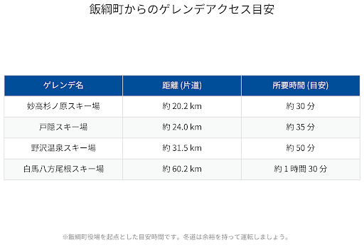 いいづなリゾートスキー場以外にも周辺のゲレンデには上記の時間でアクセスが可能です。